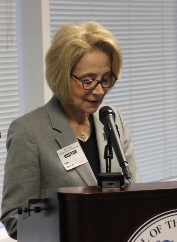 Mary G. Bennett, a member of the State Board, read the resolution honoring New Jersey’s 5,000 nonpartisan local board of education members and charter school trustees, which the resolution describes as “public servants who dedicate their time, without pay or benefit, to the oversight of school district operations, through sound financial practices and comprehensive policies on curriculum, staffing and other areas to ensure the well-being and academic achievement of all students in the district.”