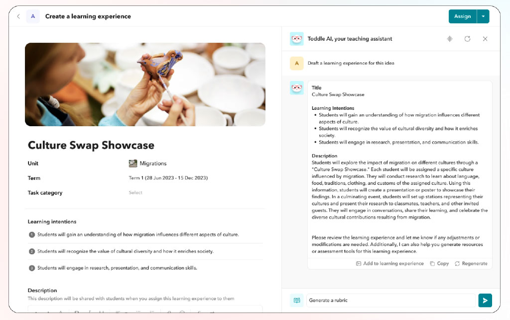 With AI embedded in the workflow, curriculum creation becomes more efficient and collaborative. Teachers can draw on an AI-powered Curriculum Design Assistant to generate course outlines, suggest learning experiences, and create differentiated tasks in minutes—giving them back valuable time while raising the overall quality of instruction. In a recent survey, 95% of teachers using Toddle reported saving two to five hours every week—precious time they can reinvest in their students.