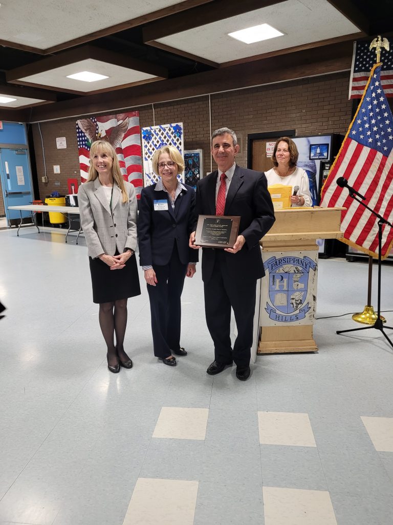 The Montville board was honored with the Carole E. Larsen Master Board Certification at the Morris County School Boards Association’s meeting at Parsippany Hills High School June 16. Left to right: Dr. René Rovtar, superintendent; Dr. Karen Cortellino, board member; and Michael Palma, vice president of the Montville Township Board of Education; and Charlene Peterson, a field service representative with the New Jersey School Boards Association (at the lectern). Not pictured are board members Charles Grau, Joseph Daughtry, Christine Fano David Modrak, Michael O’Brien, Michael Rappaport and Michelle Zuckerman. The certification is awarded in recognition of high-performing boards. The board must provide evidence to demonstrate an emphasis on student achievement in their board actions. To earn the Carole E. Larsen Master Board Certification, a certified board must also complete at least 10 additional hours of training for a total of 26 board credits within two years after earning its certification.