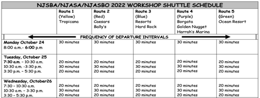 NJSBA is providing transportation service between the convention center and hotels via jitney for Workshop 2022. The jitney schedule and pickup locations are listed below.